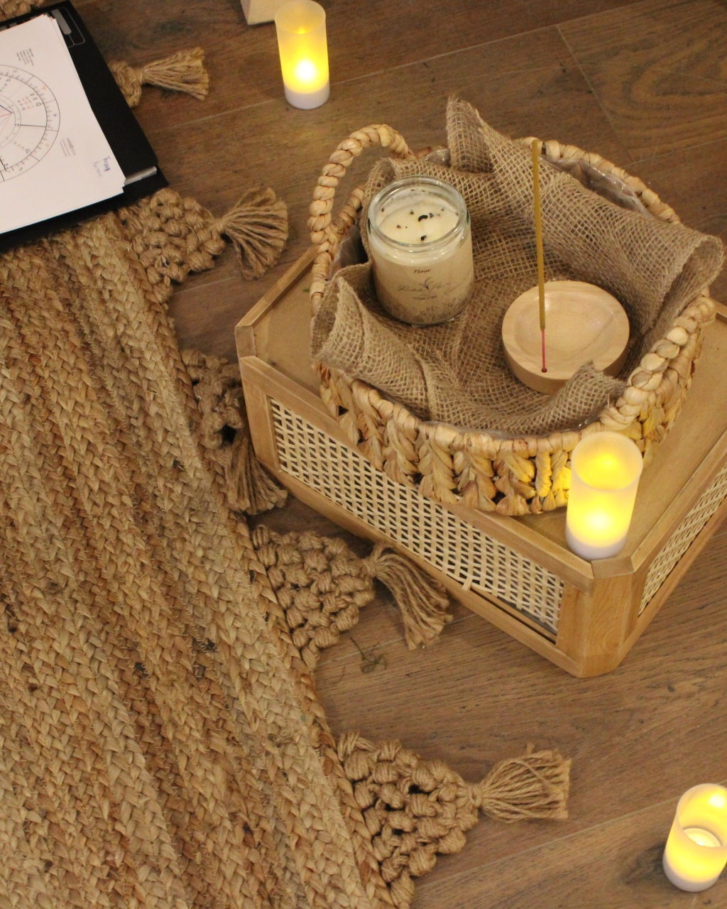 • Choix d’huiles essentielles, fleurs séchées et éléments symboliques selon votre énergie (terre, feu, air, eau)