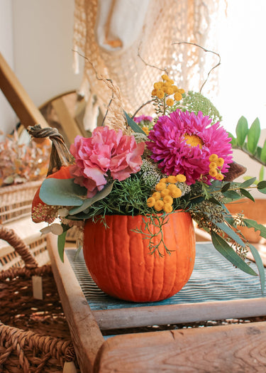 Nos citrouilles creusées sont transformées en véritables vases naturels, remplies de fleurs fraîches aux couleurs de l’automne.