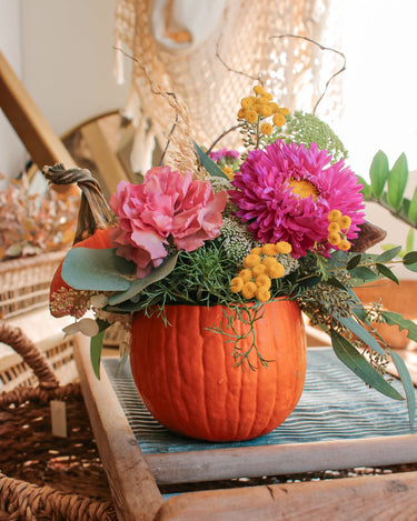 Lors de cet atelier créatif, vous réaliserez une citrouille creusée garnie de fleurs fraîches, parfaite pour apporter couleur et élégance à votre table.