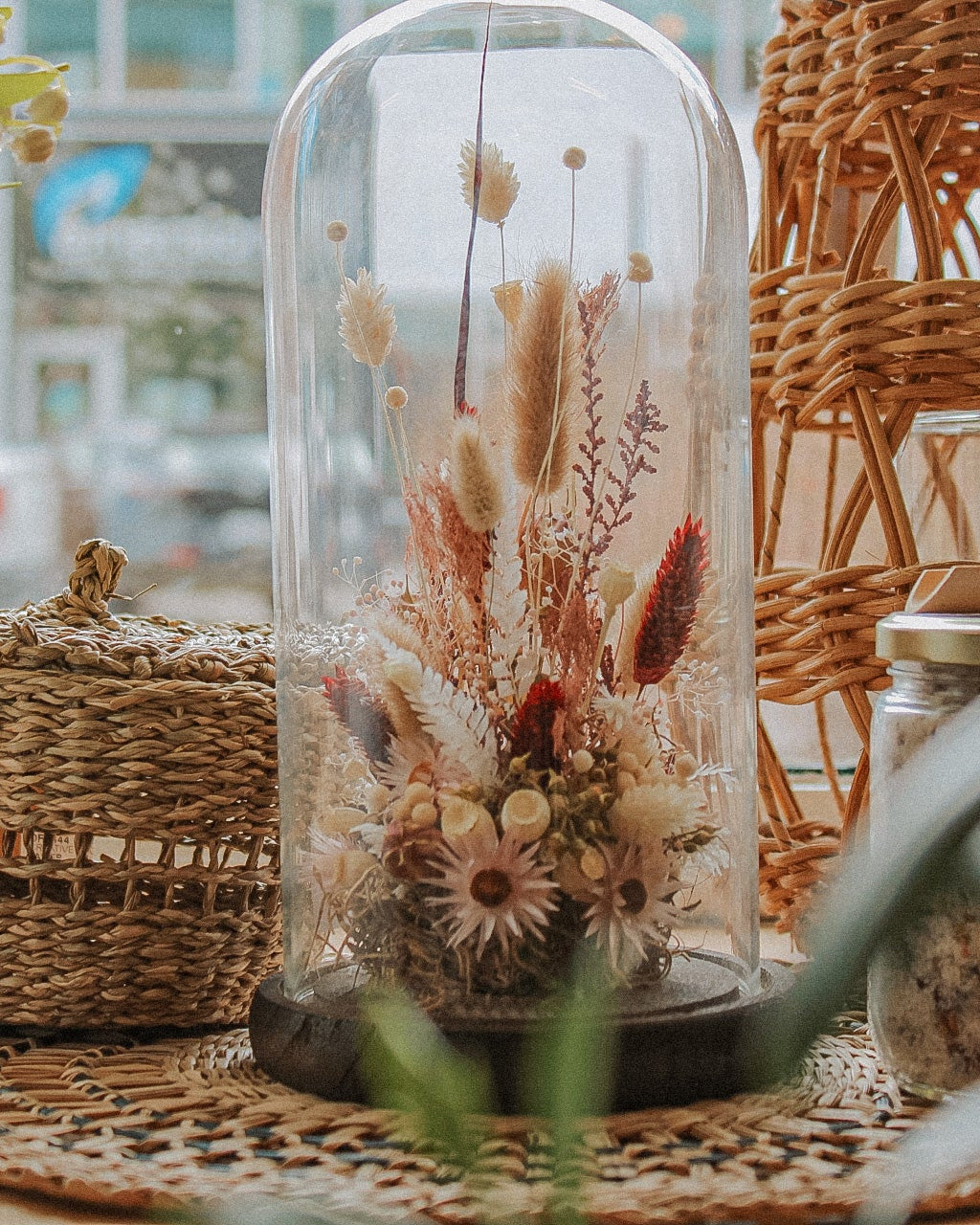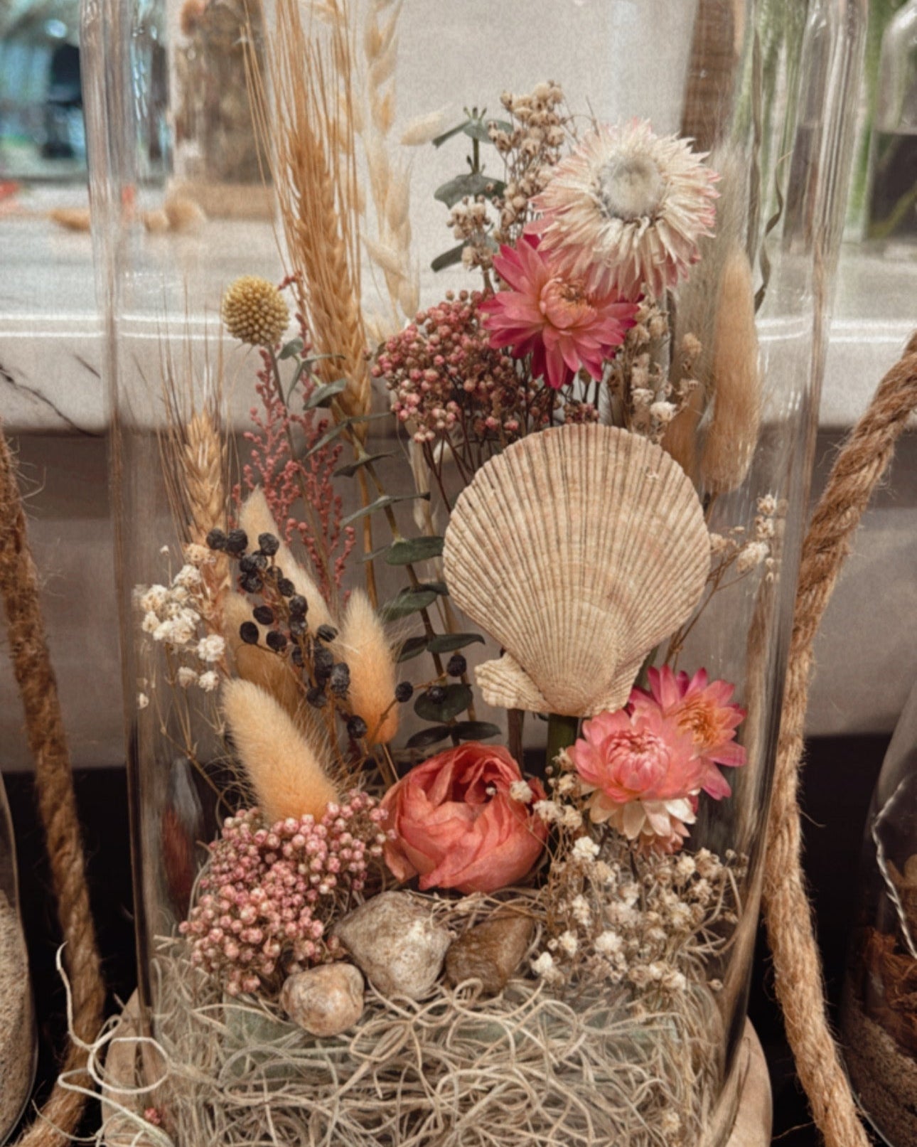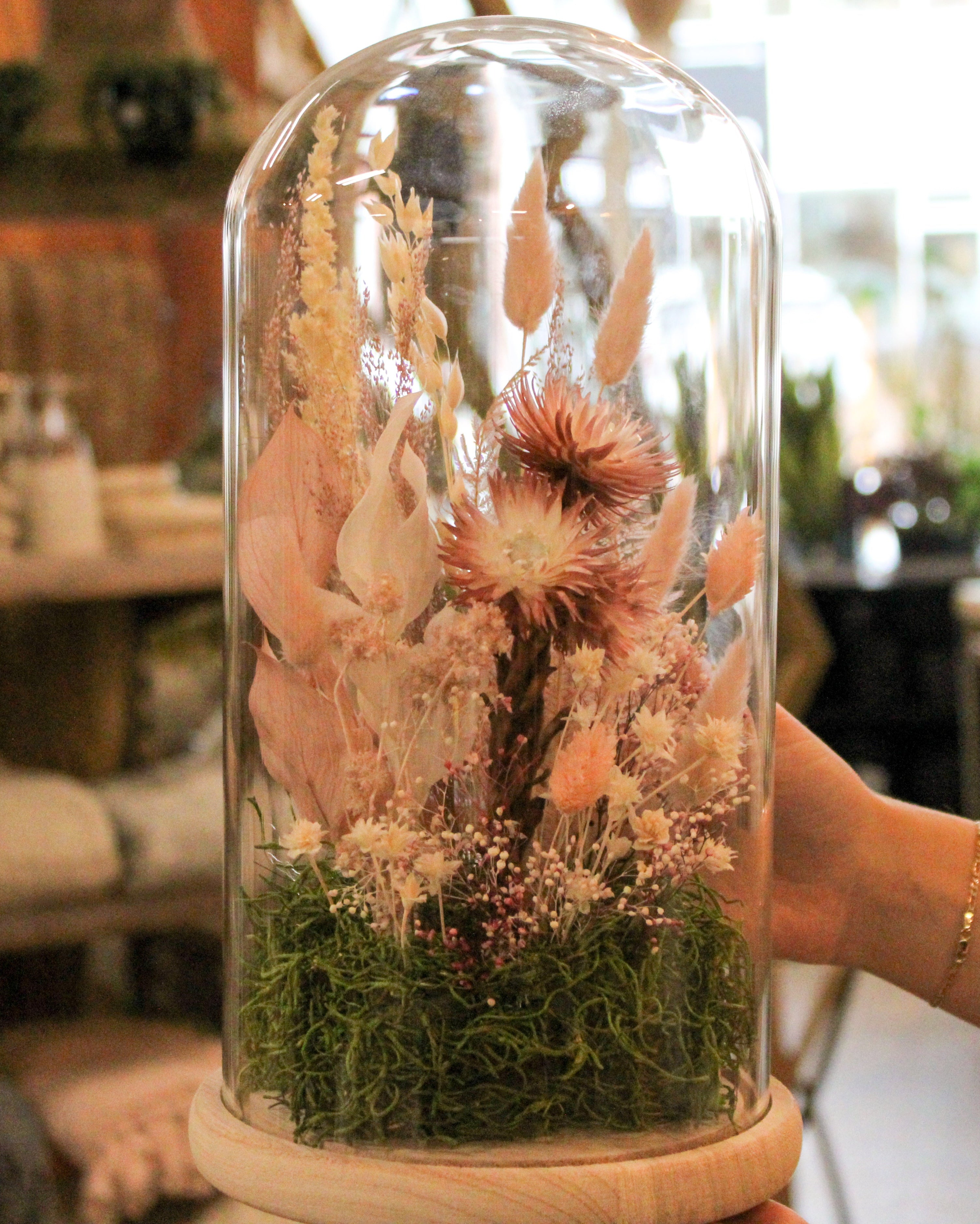 Apportez une touche de poésie et d’élégance à votre intérieur avec cette cloche de fleurs séchées, une véritable œuvre florale figée dans le temps.