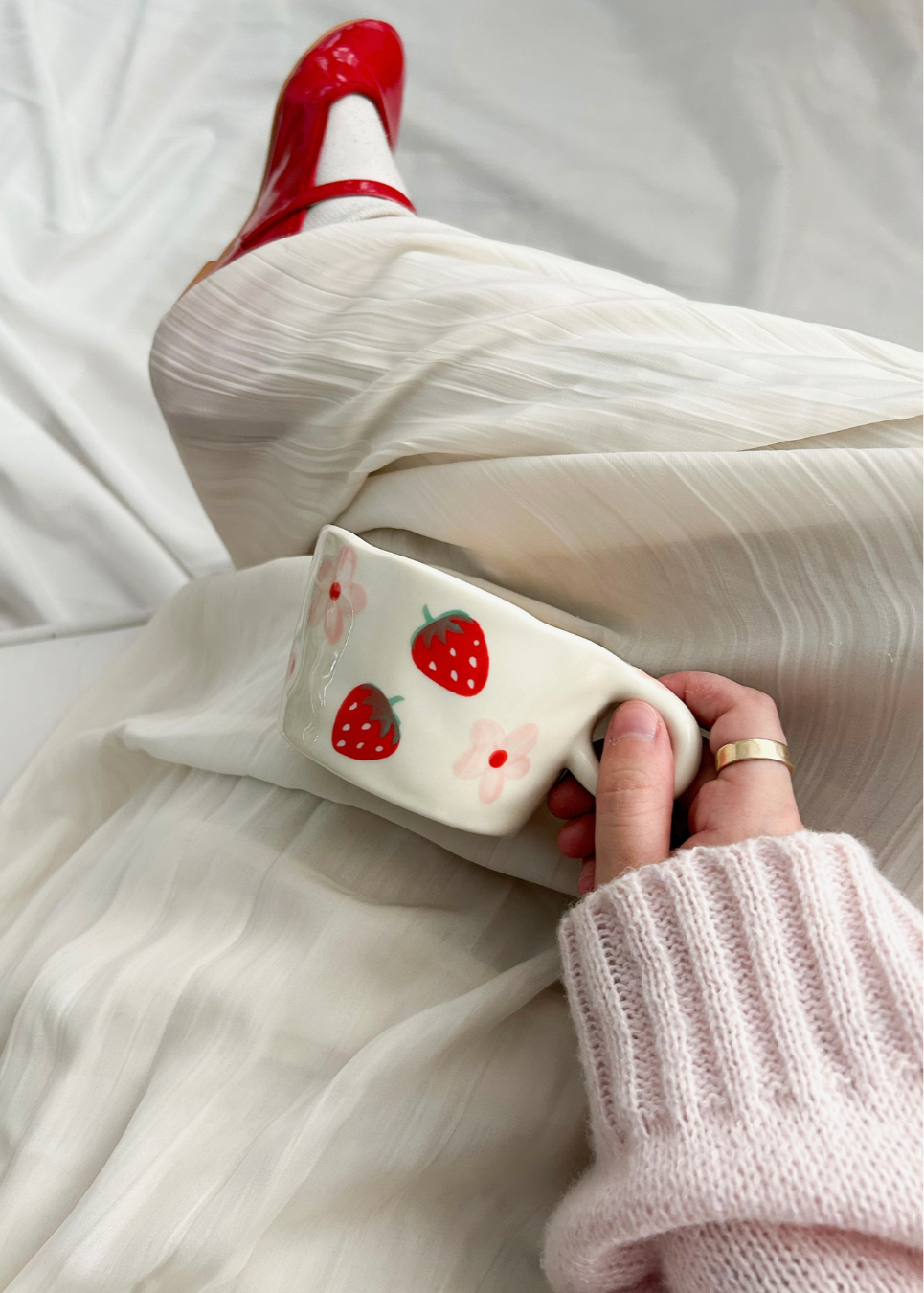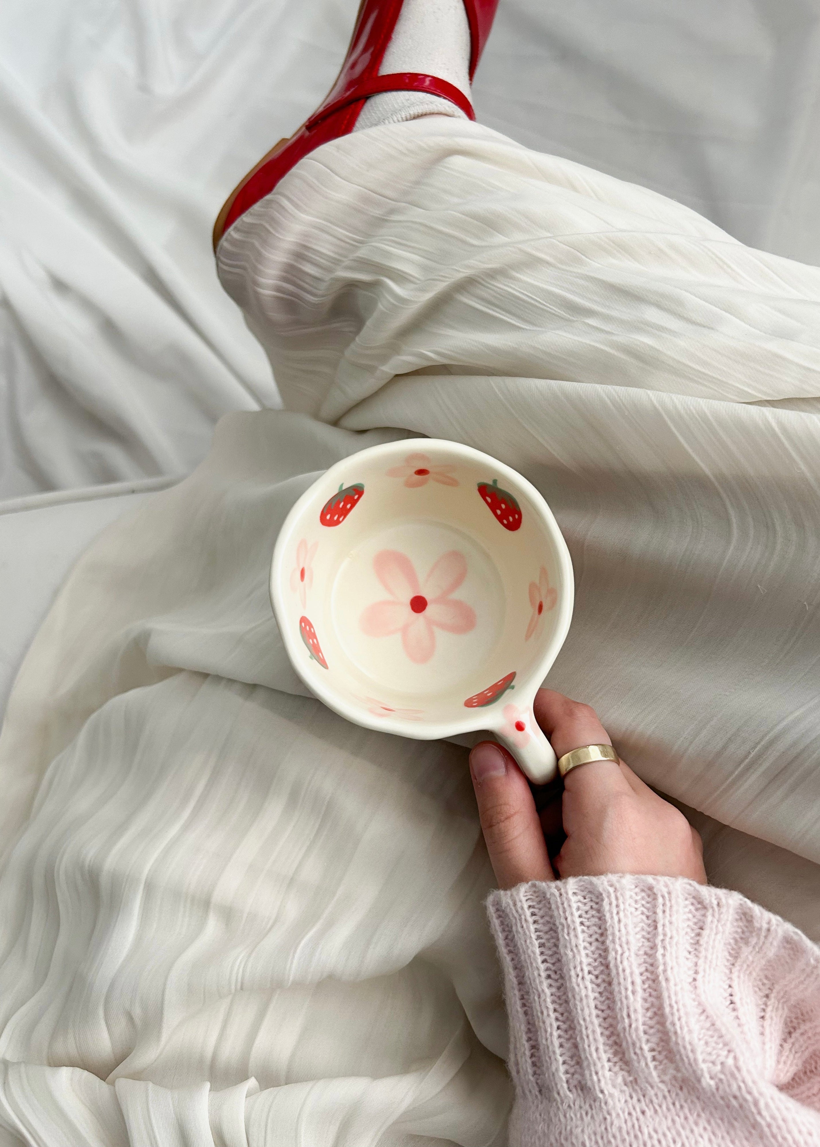 Jolie tasse aux motifs de fraises et de fleurs peints.