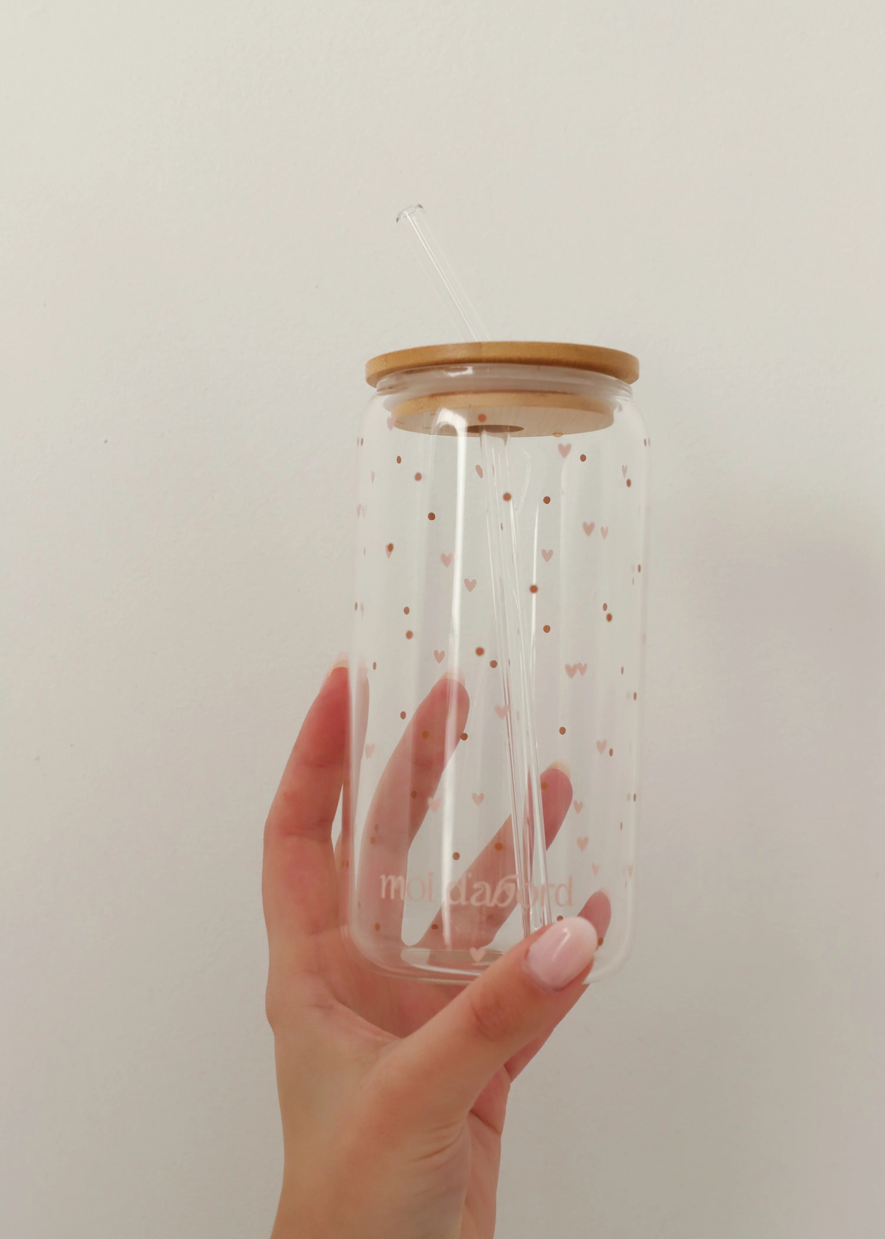 Tumbler en verre aux motifs de cœurs roses et de délicats picots bruns avec un couvercle en bambou, pour un breuvage à boire chez soi ou sur la route.