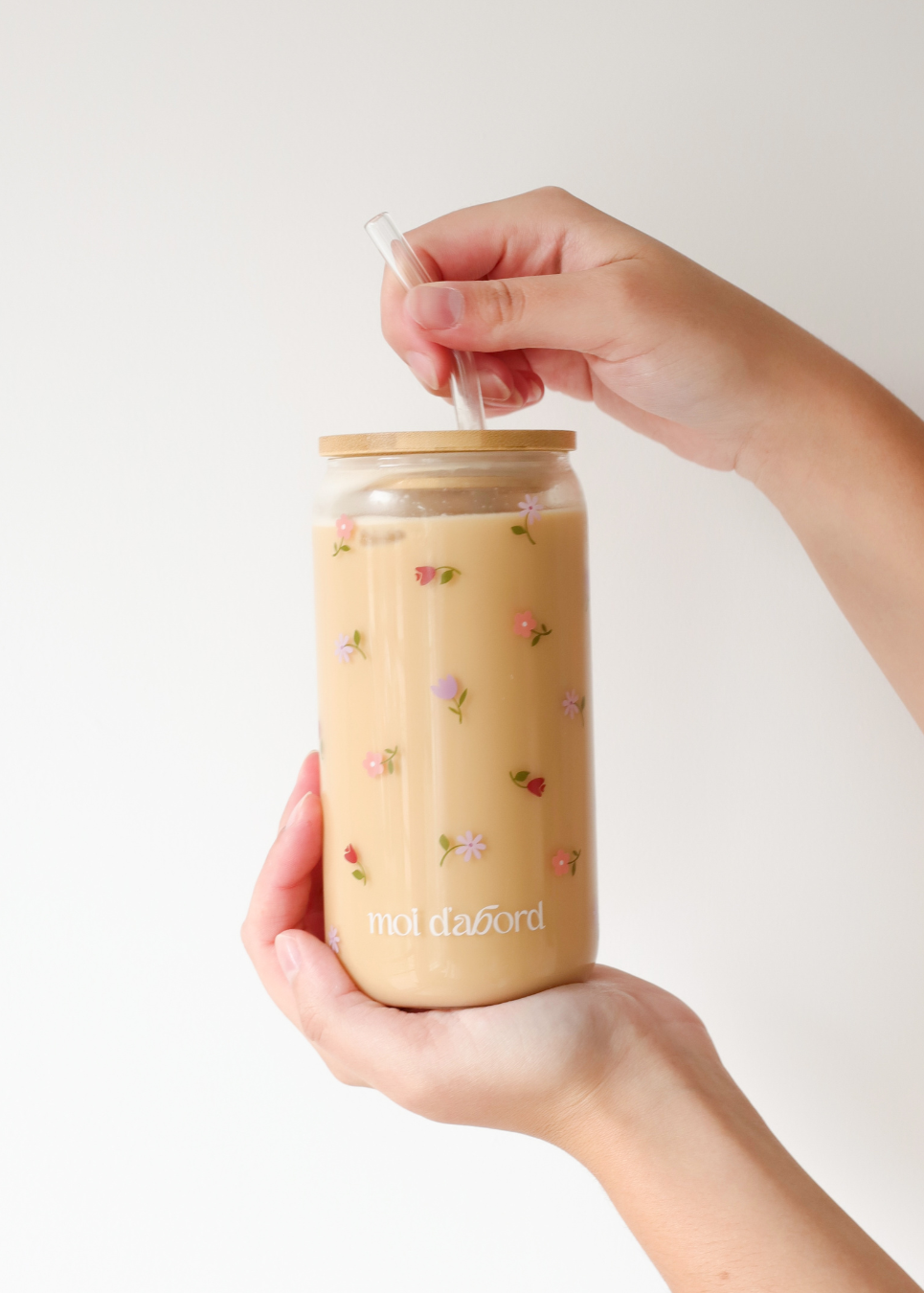 Tumbler en verre aux motifs fleuris avec un couvercle en bambou, pour un breuvage à boire chez soi ou sur la route.