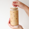 Tumbler en verre aux motifs fleuris avec un couvercle en bambou, pour un breuvage à boire chez soi ou sur la route.