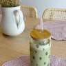 Tumbler en verre aux délicats motifs de tulipes mauves, avec un couvercle en bambou, parfait pour savourer ton breuvage préféré à la maison ou sur le pouce.